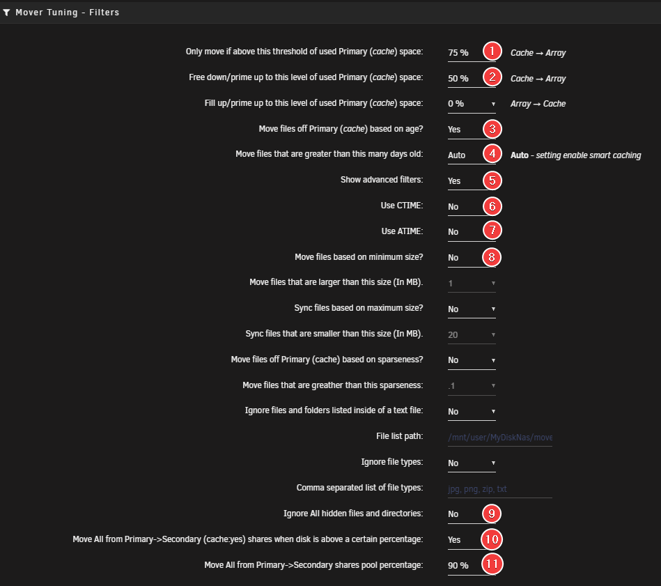 - Set the percentage of disk space used on the Primary pool that triggers a move of all files from your cache to your array.