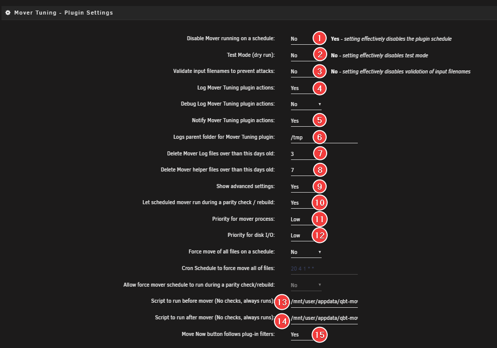 - We recommend using Mover Tuning. If you do, make sure Move files that are greater than this many days old matches the number of days you set in the qBit-Mover script or config.