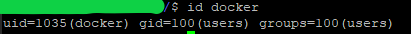 In the screenshot above this is 1035 for the Docker user and 100 is the GID (aka PGID) for the user's group.